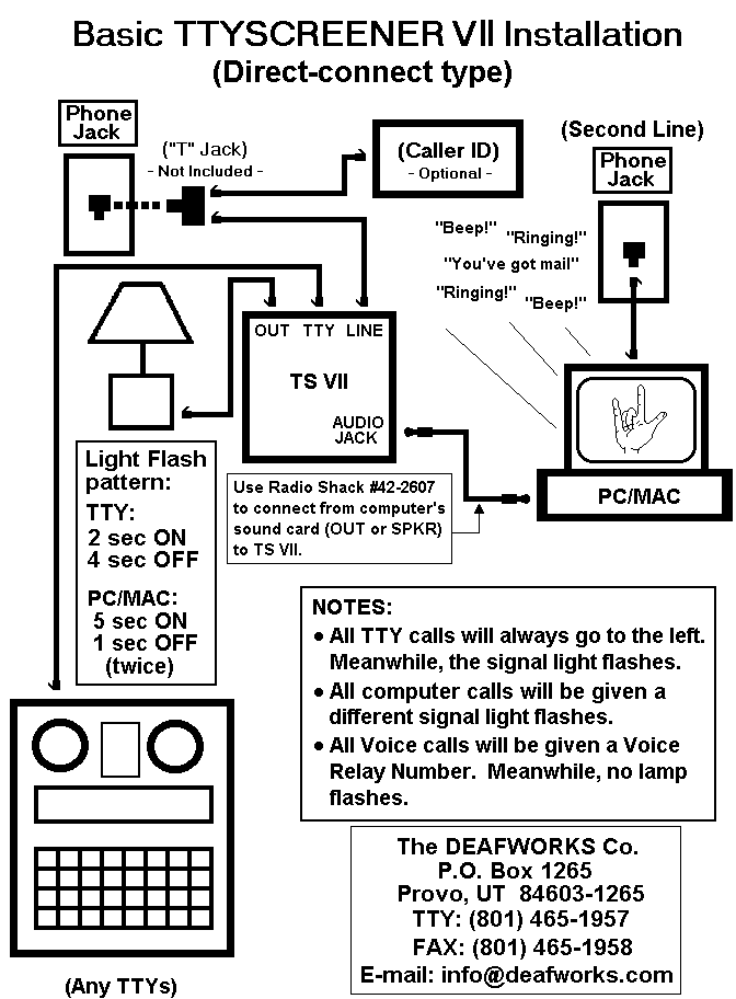 P.O.Box 1265 Provo, UT 84603-1265 USA VOICE RELAY: (800) 855-2881 UTAH VOICE RELAY: (888) 735-5906 TTY: (801) 465-1957 FAX: (801) 465-1958 Internet: www.deafworks.com E-mail: info@deafworks.com Hours: 9:00AM-6:00PM (Mountain Time - MST) Monday through Friday |
